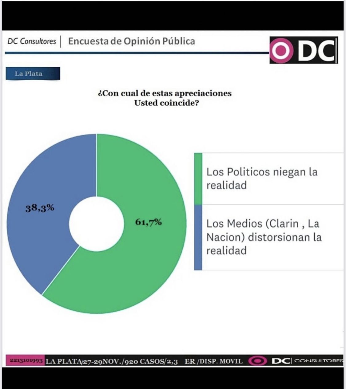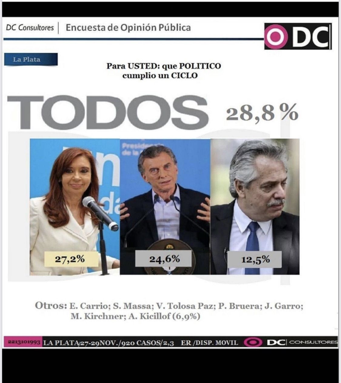 Uno de los datos más impactantes que surge del sondeo es que un 61,7% de los consultados afirma que los políticos niegan la realidad contra un 38,3% que responsabiliza a los medios por distorsionarla. Frente a la pregunta ¿qué político cumplió su ciclo? un 28% contesto: todos. Un 27,2% eligió a Cristina Fernández de Kirchner, 24,6% a Mauricio Macri, el 12,5% a Alberto Fernández. Mientras que un 6,9% decide jubilar a Elisa Carrió, Sergio Massa, Máximo Kirchner y Axel Kicillof.