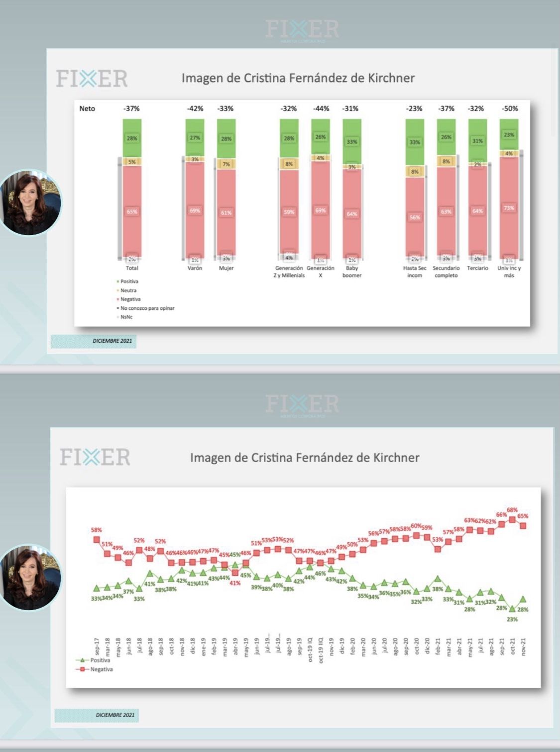 El sondeo fue realizado la semana pasada a nivel nacional con más de 2.000 casos y muestra a la vicepresidenta con 65% de imagen negativa y 28% de positiva, mientras que Máximo recibe el mismo porcentaje de rechazos y apenas un 22% de popularidad. Alberto y Aníbal Fernández siguen en el ranking con la misma imagen negativa: 63%. A su vez, Axel Kicillof está con 61% de rechazos y con un punto menos aparece Juan Manzur.