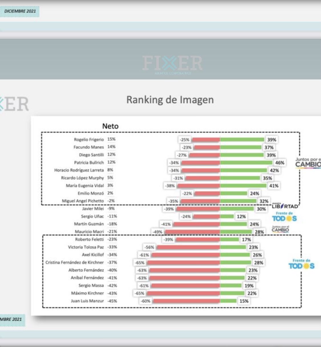 Tomando el nivel de conocimiento, imagen negativa y positiva, el sondeo de Fixer hace una tabla de posiciones con el diferencial. La lidera Rogelio Frigerio con el 15%, mostrando mayor brecha positiva entre sus adhesiones y rechazos. Luego viene Facundo Manes con el 14%, se ubican terceros Diego Santilli y Bullrich con 12% y recién después aparece Rodríguez Larreta con 8%.