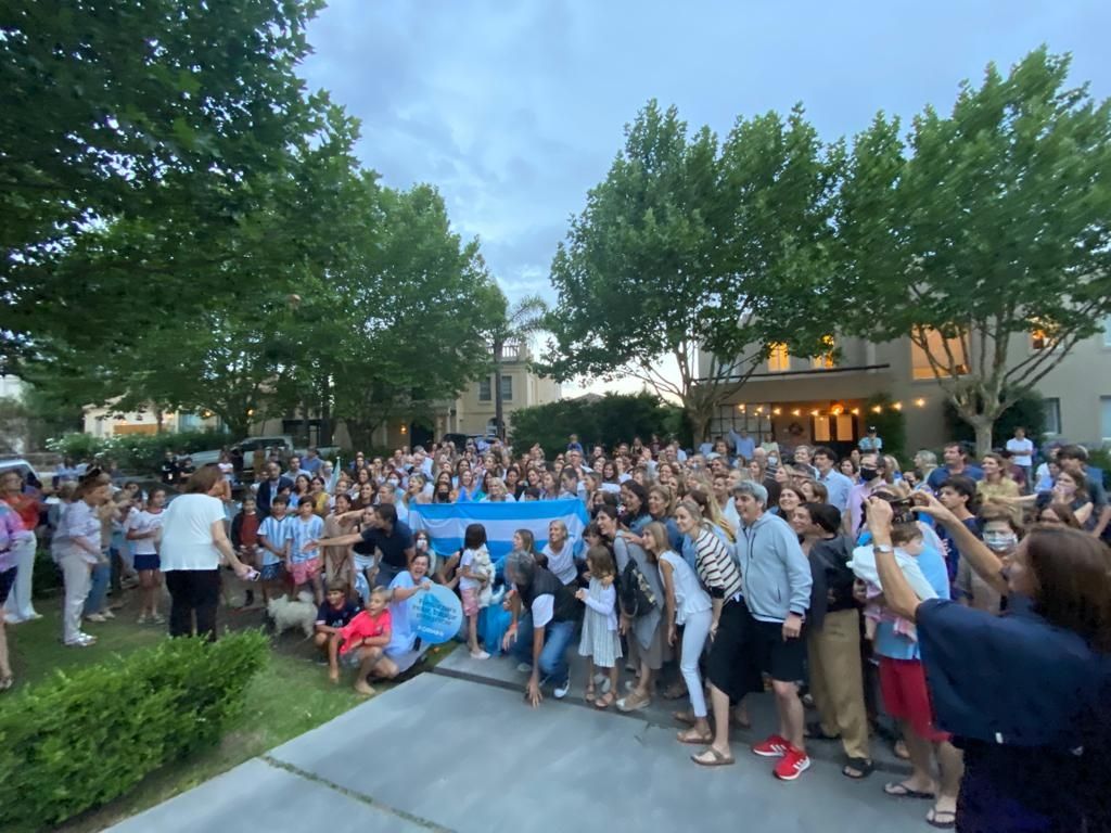 ¿Y si vamos a cantarle el himno? propuso uno de ellos. En ese momento algunos de los que integran ese grupo se estaban enterando de que Esteban era un vecino más. Y así fue: el plan se puso en marcha a las 19.45, cuando Esteban ingresaba al barrio y los vecinos lo estaban esperando frente de su casa para cantarle el himno: