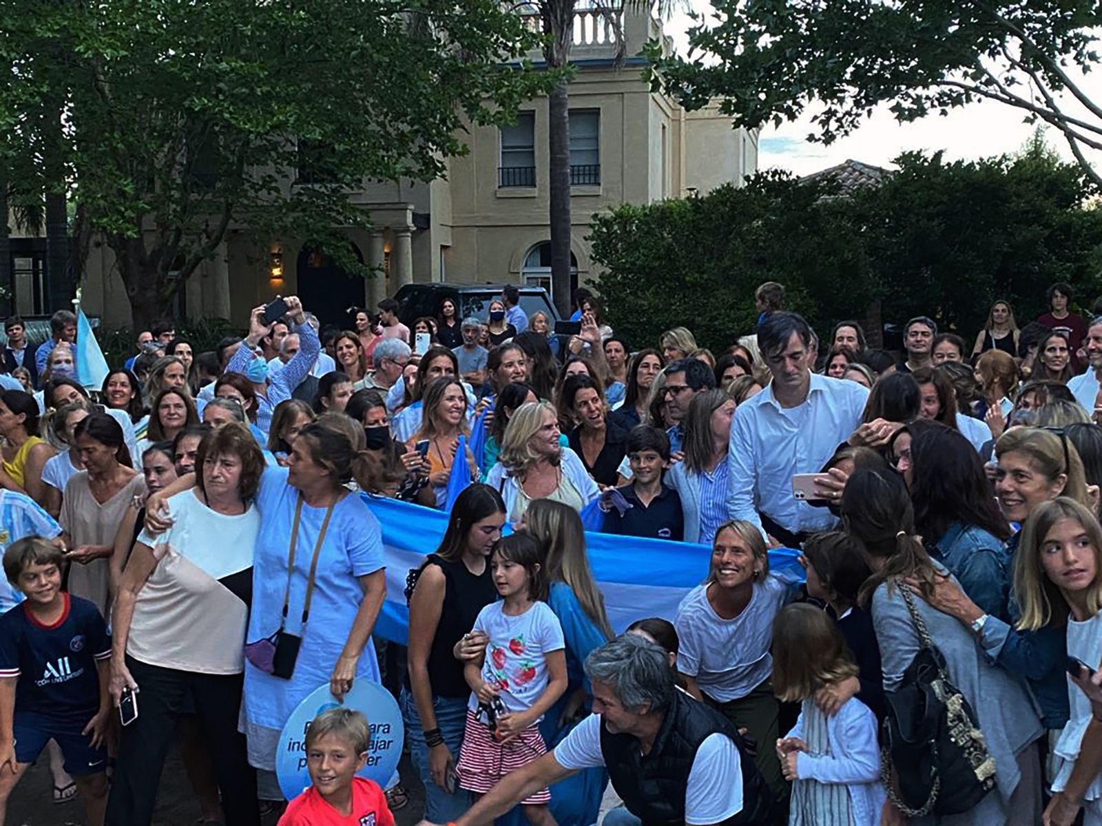 Bullrich se bajó del vehículo en el momento que los vecinos entonaban la parte del himno que dice "Y los libres del mundo responden..". Su mujer y al menos dos hijas lo acompañaban. Con señas pidió que lo ayudaran a caminar hasta la estatua de la Virgen María que tiene en el ingreso a su vivienda para allí apoyar y sostener su cuerpo.