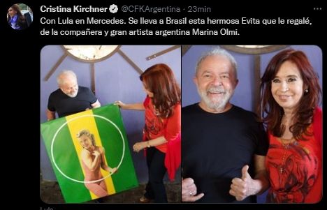 "Con Lula en Mercedes. Se lleva a Brasil esta hermosa Evita que le regalé, de la compañera y gran artista argentina Marina Olmi", escribió Cristina Kirchner en su cuenta de Twitter.