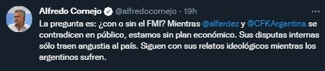 "Acá tiene que quedar bien claro quién el que negocia y acuerda con el Fondo Monetario Internacional, la oposición después apoyará, pero la responsabilidad del acuerdo es del gobierno de Alberto Fernández y Cristina Kirchner, así que si ella no firma apoyando, nosotros tampoco lo haremos", cerró Cornejo.