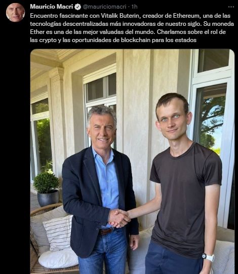 "Encuentro fascinante con Vitalik Buterin, creador de Ethereum, una de las tecnologías descentralizadas más innovadoras de nuestro siglo. Su moneda Ether es una de las mejor valuadas del mundo. Charlamos sobre el rol de las crypto y las oportunidades de blockchain para los estados", resaltó Macri en su cuenta de Twitter al compartir una foto junto a Vitalik.