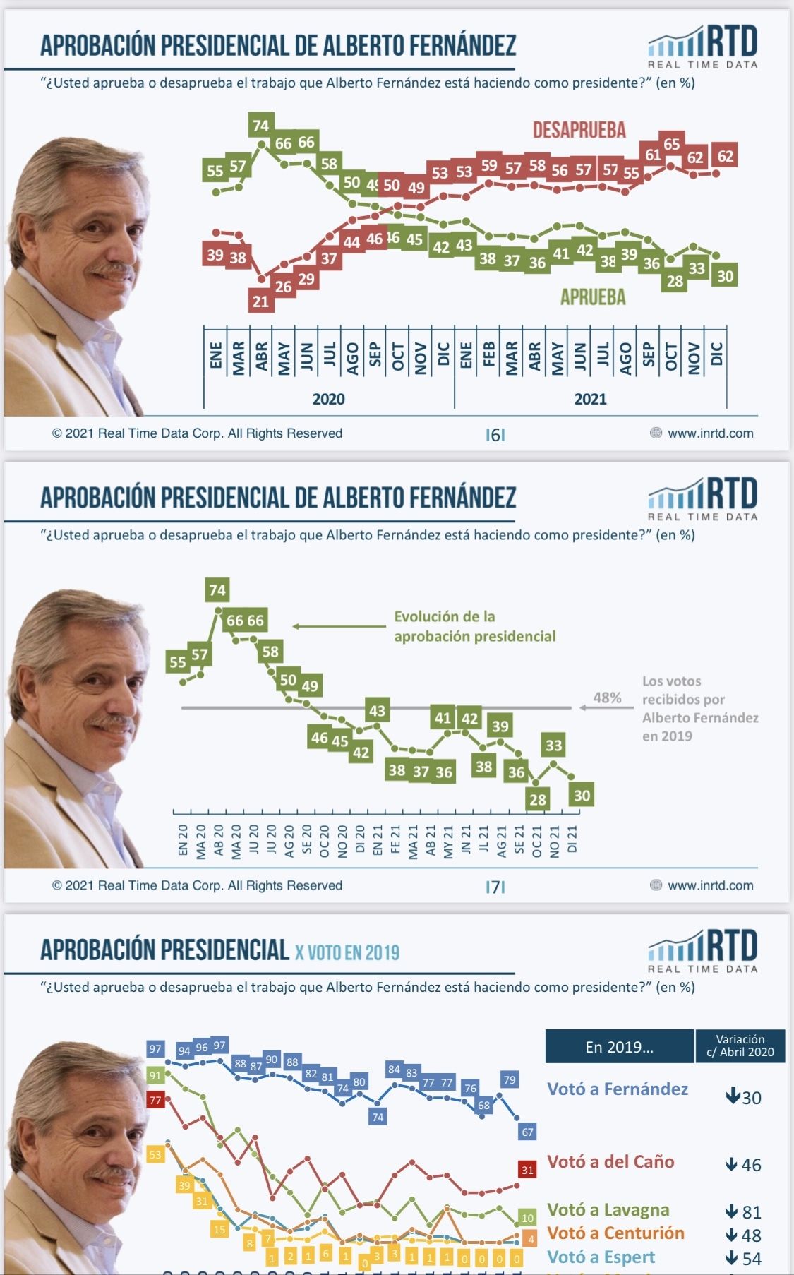 A su vez, los otros datos destacados de la encuesta es que el presidente Alberto Fernández cierra el año con un nivel de aprobación del 30%, doce puntos por debajo del nivel de hace un año atrás y en los valores mínimos de su mandato presidencial. El descenso en la aprobación de Fernández de 2021 se vio acompañado por un debilitamiento en la percepción de la autoridad presidencial: sólo el 15% de los entrevistados señala al jefe de Estado como la figura más importante del gobierno.