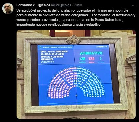 El diputado nacional Fernando Iglesias (Juntos por el Cambio) apuntó contra los diputados de izquierda por acompañar el proyecto del oficialismo. "Se aprobó el proyecto del oficialismo, que sube el mínimo no imponible pero aumenta la alícuota de varias categorías. El peronismo, el trotskismo y varios partidos provinciales, representantes de la Patria Subsidiada, imponiendo nuevas confiscaciones al país productivo", escribió Iglesias en su cuenta de Twitter.