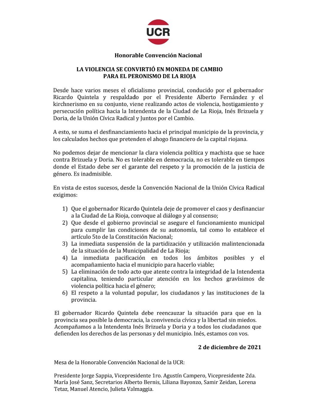 "Desde hace varios meses el oficialismo provincial, conducido por el gobernador Ricardo Quintela y respaldado por el presidente Alberto Fernández y el kirchnerismo en su conjunto, viene realizando actos de violencia, hostigamiento y persecución política hacia la intendenta de la Ciudad de La Rioja, Inés Brizuela y Doria, de la Unión Cívica Radical y Juntos por el Cambio", agregan desde el partido opositor en el que exhortan al gobernador a poner fin a esta situación.
