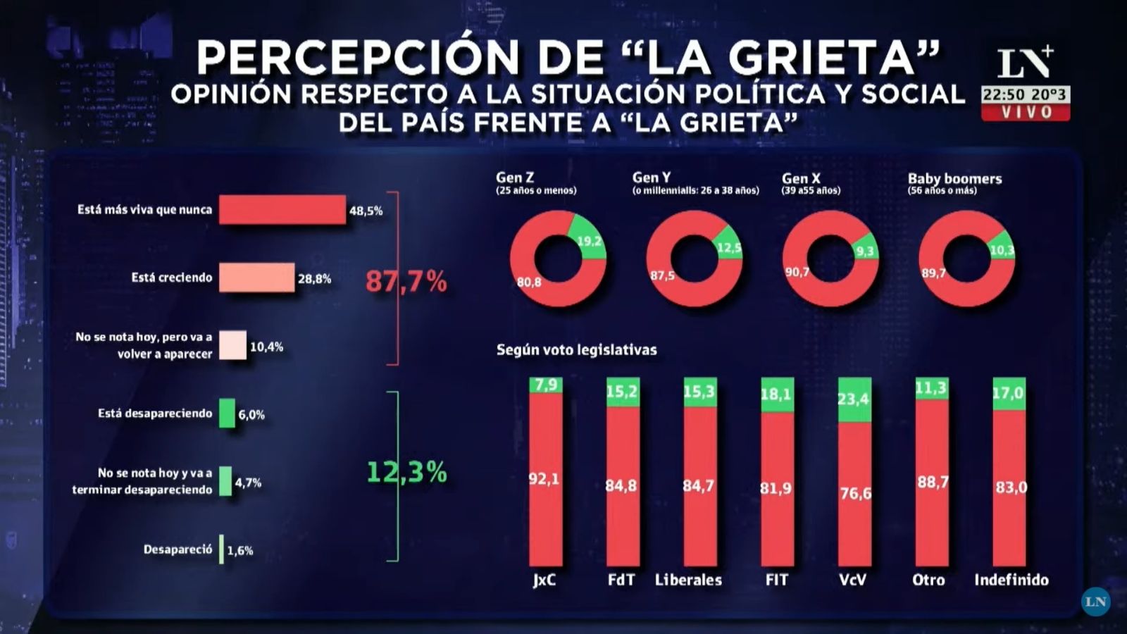Dicha encuesta también analizó cuál es la percepción actual de la grieta entre los argentinos, y los resultados fueron contundentes: el 87,7% dice que está más viva que nunca o que está creciendo, mientras que solo el 12,3% opina que se está achicando o que desaparecerá eventualmente. Cabe resaltar que estos números se repiten en todas las franjas etarias y simpatizantes de partidos políticos, lo que habla de un fenómeno social que debería preocupar y mucho a quienes tienen en sus manos los destinos del país.