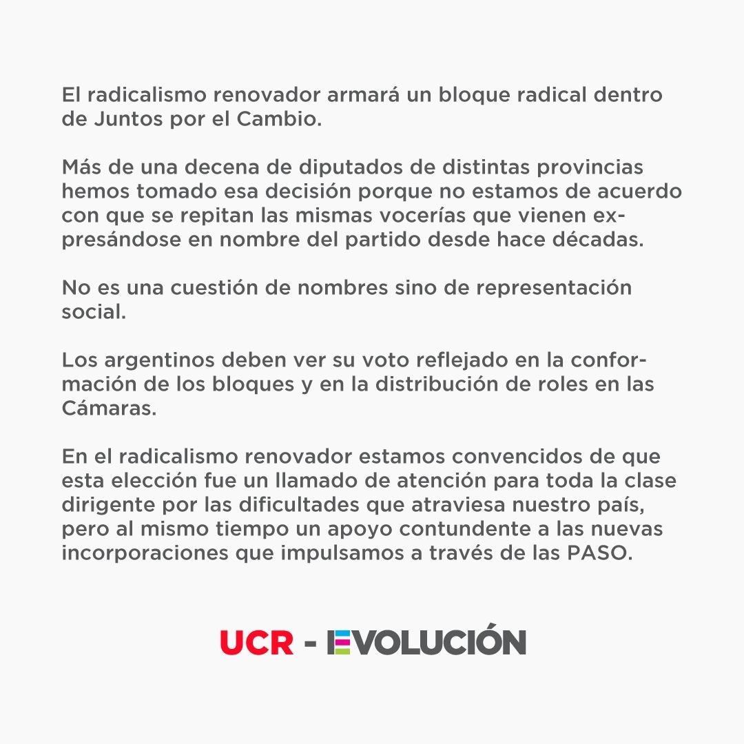 En ese marco, Martín Lousteau amenazaba con formar un bloque aparte debido a su interna con el diputado Mario Negri. El senador Lousteau jugó fuerte en las elecciones pese a no ser candidato. Y muchas de las apuestas que presentó resultaron ganadoras. Ahora, exigía cobrar parte del premio con mayor protagonismo para los propios en el Congreso de la Nación. Ante la resistencia de la estructura histórica de la UCR, decidió formar el bloque Evolución con su mano derecha en Diputados, Emiliano Yacobitti.