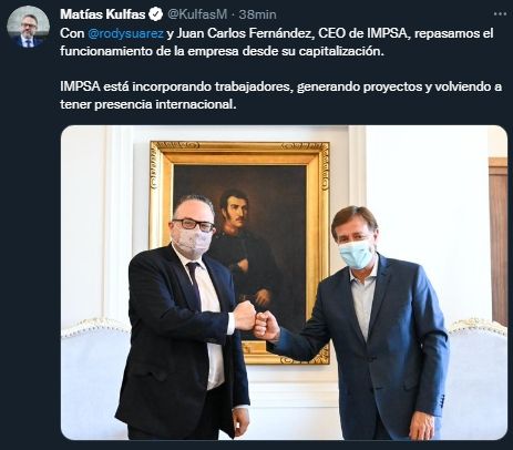 "Con @rodysuarez y Juan Carlos Fernández, CEO de IMPSA, repasamos el funcionamiento de la empresa desde su capitalización. IMPSA está incorporando trabajadores, generando proyectos y volviendo a tener presencia internacional", destacó Kulfas tras la reunión.