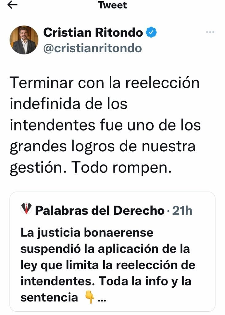 Desde el PRO salieron rápidamente a cuestionar el fallo del Juez Ocampo, que pide suspender el articulo 7 de la ley. Fueron varios los legisladores nacionales y provinciales que manifestaron su malestar a través de Twitter, como es el caso de los diputados Cristian Ritondo, Anastasia Peralta Ramos y Juan Carrara. Sin embargo, es llamativo el silencio de los intendentes amarillos que estarían impedidos de presentarse a un nuevo mandato en el 2023.