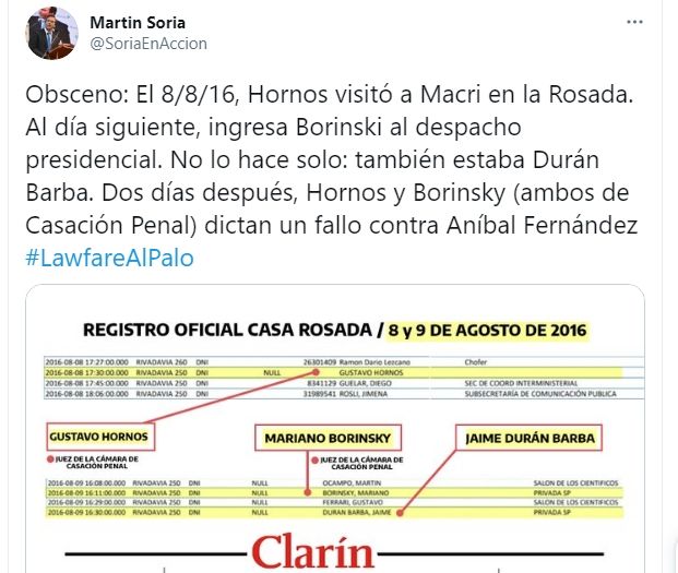 Finalmente, y en otra de sus publicaciones en las redes sociales, Soria afirmó: "Obsceno. El 8/8/16, Hornos visitó a Macri en la Rosada. Al día siguiente, ingresa Borinsky al despacho presidencial. No lo hace solo: también estaba Durán Barba. Dos días después, Hornos y Borinsky (ambos Casación Penal) dictan un fallo contra Aníbal Fernández".