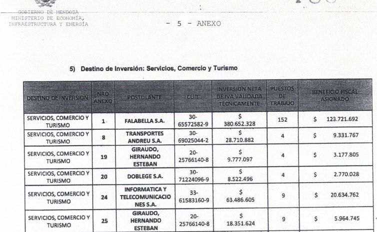 En 2019 Falabella recibió un beneficio fiscal por 124 millones de pesos de parte del Estado mendocino. Es decir tenía a su favor como crédito fiscal (a cambio del pago de impuestos locales) por ese monto. La promesa de la empresa era invertir 380 millones de pesos y crear 152 puestos de trabajo. Así figura en la resolución 188 del 2019. Esa firma fue la más favorecida por el llamado Bono Fiscal 2, pues ninguna otra empresa beneficiada obtuvo beneficios por montos similares en el marco del "Programa de Fomento a la Inversión Estratégica".