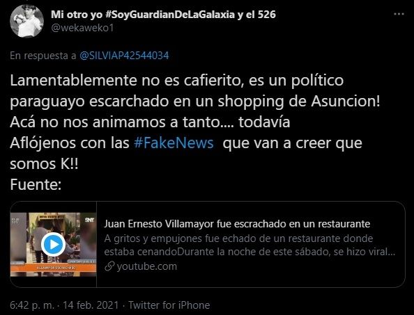 La primera respuesta que se puede leer ya desmiente la breve información del tuit original. "Lamentablemente no es cafierito, es un político paraguayo escarchado en un shopping de Asunción! Acá no nos animamos a tanto.... todavía. Aflójenos con las #FakeNews que van a creer que somos K!!", indicó un usuario.