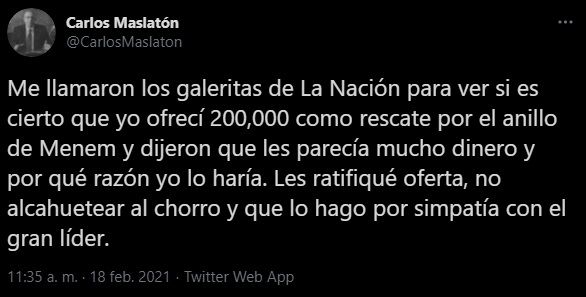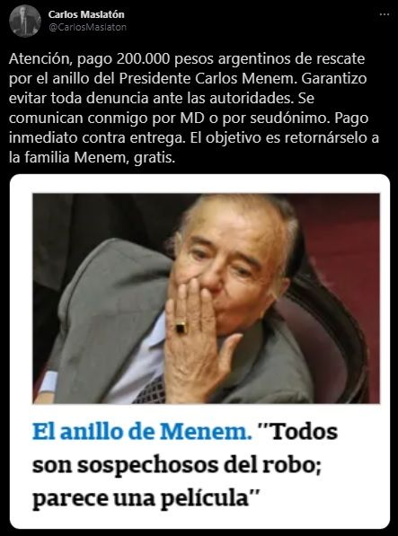 "Atención, pago 200.000 pesos argentinos de rescate por el anillo del Presidente Carlos Menem. Garantizo evitar toda denuncia ante las autoridades", expresó el reconocido tuitero.
