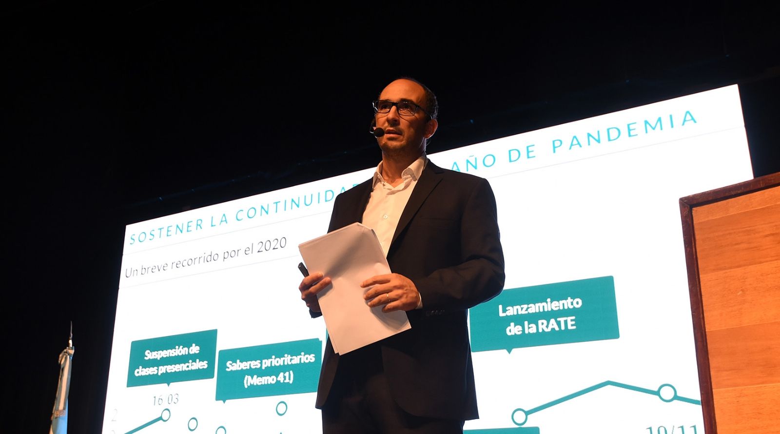 "Estamos convencidos de que podemos tener presencialidad con distintos formatos en cada una de las escuelas", adhirió en el acto de apertura del ciclo lectivo 2021 ante la atenta mirada de decenas de supervisores. "A veces las decisiones se van a tomar por escuelas. Cada escuela no va a poder decidir si abre o no, pero si definir su hoja de ruta", adhirió.