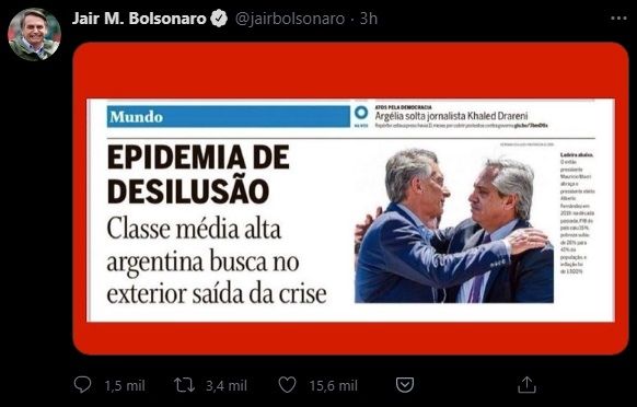 Este lunes llegó un nuevo mensaje vedado, en forma de sutil ironía. Bolsonaro compartió en su cuenta de Twitter -en la que tiene 6.6 millones de seguidores- un artículo del periódico O Globo, titulado "Epidemia de desilusión, la clase media alta de Argentina busca el exterior como una salida a la crisis".