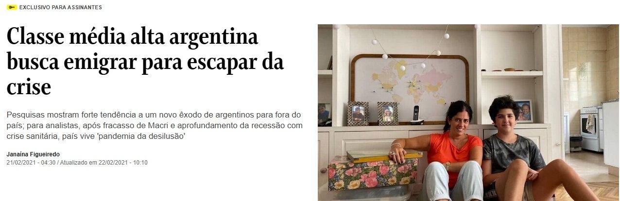El artículo indica que tras el "fracaso" de Macri, Argentina vive "una epidemia de desilusión" en medio de la pandemia. La periodista Janaína Figueiredo remarca que las personas más golpeadas pertenecen a la clase media y alta, que eligen emigrar, principalmente, a "España, Estados Unidos, Italia y, en algunos casos, países limítrofes con una vida política y económica menos convulsa, entre ellos Uruguay y Chile".
