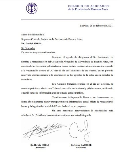 El Consejo Superior del Colegio de Abogados de la Provincia de Buenos Aires, reunido este jueves a la mañana, emitió un comunicado en el que le pide al Supremo Tribunal de Justicia bonaerense que "se expida institucional y públicamente, ratificando o rectificando la información difundida sobre la vacunación contra el covid-19 de dos miembros de ese cuerpo".