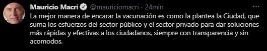 "La mejor manera de encarar la vacunación es como la plantea la Ciudad, que suma los esfuerzos del sector público y el sector privado para dar soluciones más rápidas y efectivas a los ciudadanos, siempre con transparencia y sin acomodos", cerró Macri en su cuenta de Twitter.