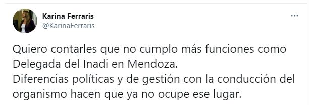 "Quiero contarles que no cumplo más funciones como Delegada del Inadi en Mendoza. Diferencias políticas y de gestión con la conducción del organismo hacen que ya no ocupe ese lugar", subraya Ferraris en sus redes sociales.