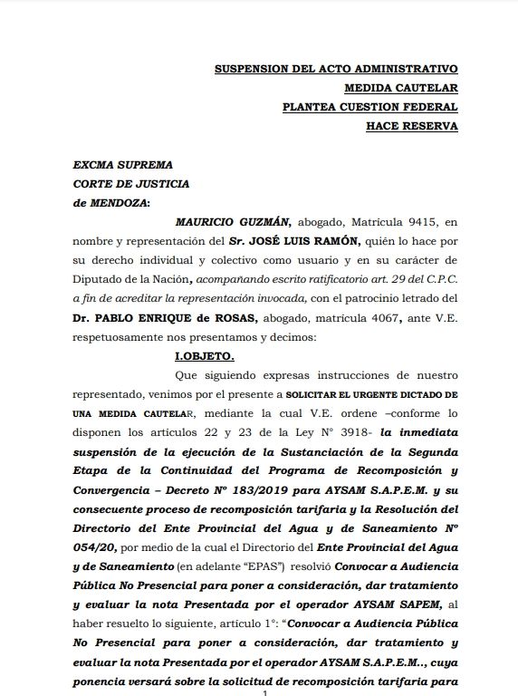 La última presentación se publicó esta semana en la lista de la Suprema Corte y apuntaba a la habilitación de la feria judicial para tratar la medida cautelar. "La demora en la resolución de la medida cautelar de Suspensión de la Ejecución del Acto Administrativo que de V.E. se solicita ocasionaría un serio perjuicio a la totalidad de Usuarios del Servicio de Agua Potable y Cloacas que AySAM", esgrimía Guzmán en representación de Ramón.