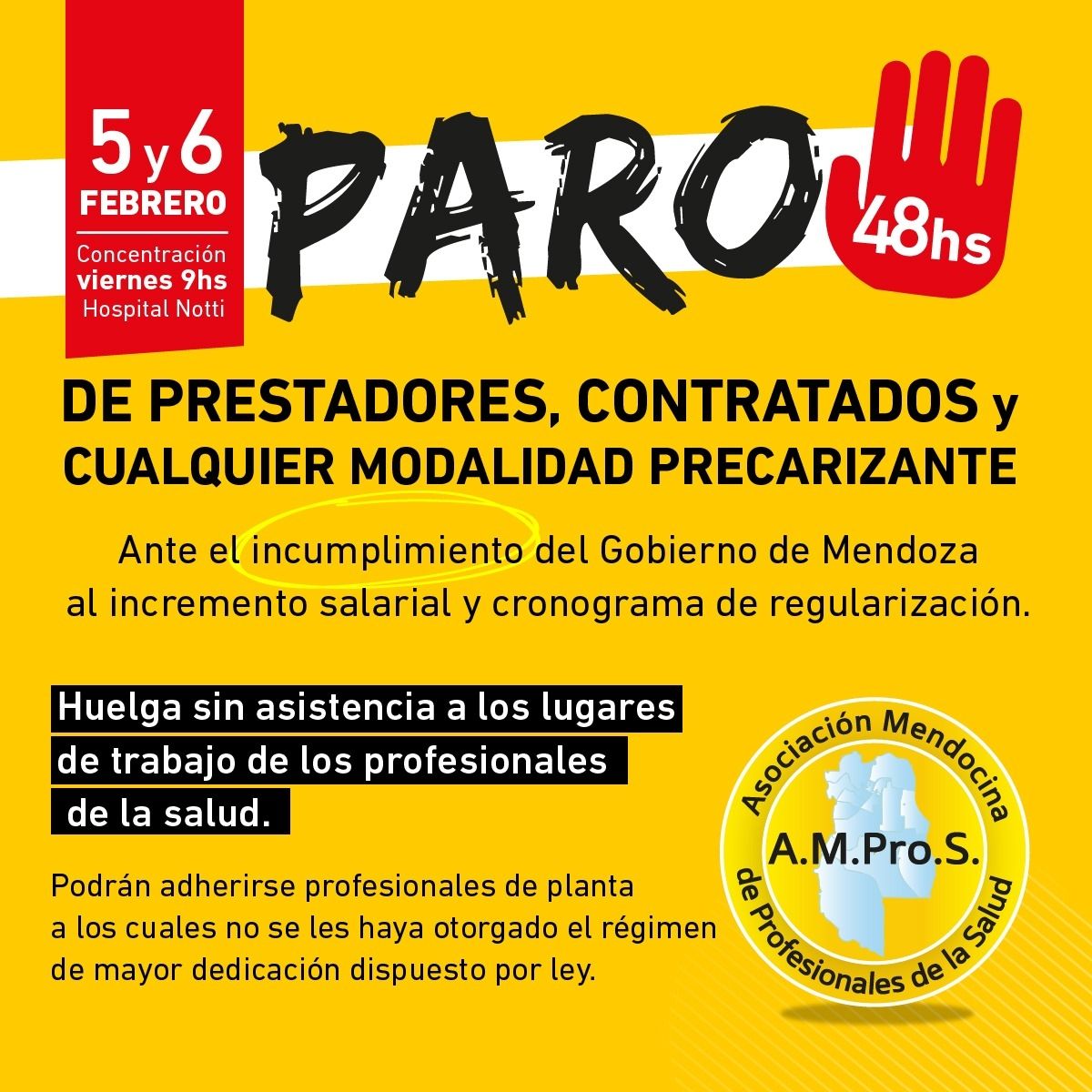 La Asociación Mendocina de Profesionales de la Salud (AMProS) ha convocado a un paro de actividades de 48 horas para los días 5 y 6 de febrero en defensa de los profesionales que se encuentran bajo la figura de contrato, prestación y cualquier otra modalidad de ese tipo.