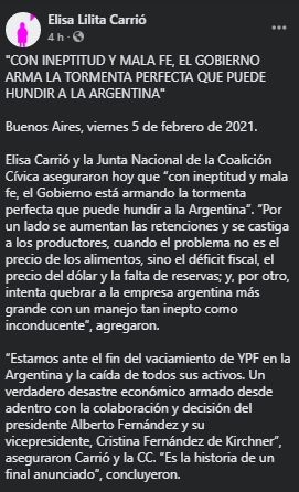 Carrió y la Junta Nacional de la Coalición Cívica indicaron en un comunicado que "con ineptitud y mala fe, el Gobierno está armando la tormenta perfecta que puede hundir a la Argentina".