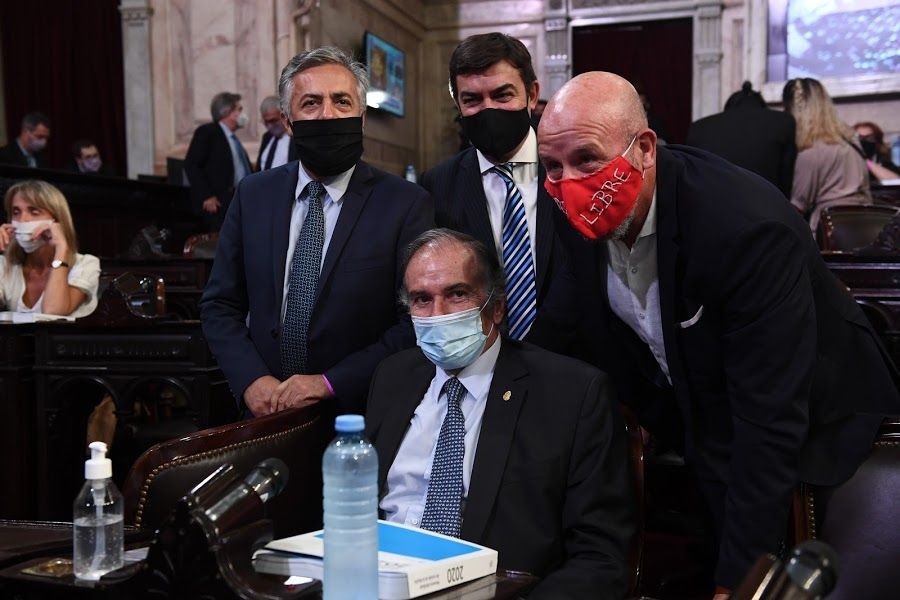 El que sí cumplió el protocolo fue Sergio Massa, que luce un "barbijo patrio", todo celeste. La oposición tiene su propia estrategia. Así, por ejemplo, la diputada Mónica Frase puso en su banca una careta de Insfrán con gorrito de preso.