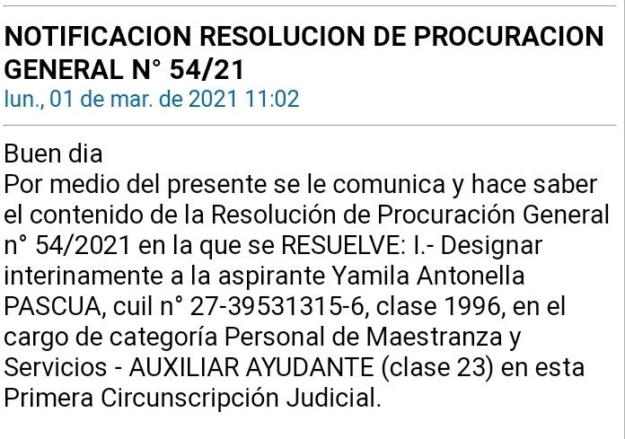 Así consta en la Resolución 54 de la Procuración General, mediante la cual se comunica que la designación interina de Yamila Antonella Pascua como personal de maestranza pero aclara que cumplirá funciones de auxiliar ayudante clase 23 en la Primera Circunscripción Judicial. Pascua es hija del fiscal Francisco Pascua.