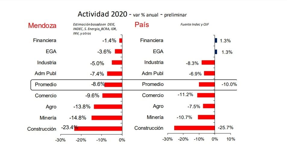 El IERAL, de la Fundación Mediterránea, presentó ayer el Informe Anual sobre la economía de Mendoza y las perspectiva para este año. Allí se ratifican los datos que se presumían: el Producto Bruto Geográfico se contrajo bruscamente (cerca del 9%), aunque un poco menos que el nacional. Y los 5 motores que identifican como claves para Mendoza se contrajeron." Además de la hecatombe sanitaria, el Covid en 2020 desató una verdadera catástrofe económica", concluye el Informe. "En Mendoza, la misma fue de tal magnitud que la contracción del empleo y de la actividad económica resultó mayor que en 2002, aunque el cierre de empresas y la caída en el poder adquisitivo del salario fueron menores. Durante 2020, los cinco tradicionales motores de corto plazo de la economía provincial fueron contractivos: el mundo, la economía nacional, el mercado laboral, el financiero y el sector público", detallan en las conclusiones.