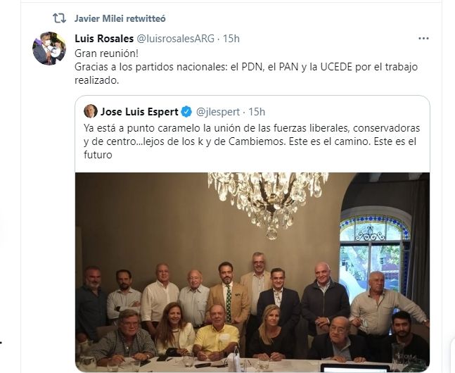 El referente liberal José Luis Espert aseguró que la unión de fuerzas conservadoras está "a punto caramelo". Lo hizo compartiendo una imagen en la que se podía ver a referentes de distintos espacios todos juntos dando origen a lo que han llamado "Frente Vamos". Sin embargo, en la foto llamó la atención la ausencia de Javier Milei y muchos usuarios en las redes sociales se preguntaron qué había pasado. El encargado de salir a aclarar el tema fue Luis Rosales.