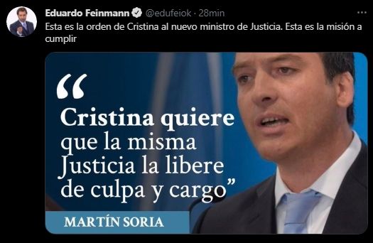 "Los Kirchner lo detestaban a Carlos Soria porque decían que los había ‘espiado’ a Néstor y Cristina. En el último tiempo, Martín Soria jugó muy fuerte para el kirchnerismo. Es el nuevo ministro de Justicia porque denunció a Mauricio Macri", completó Feinmann.