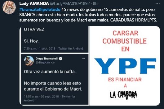 Brancatelli rápidamente se convirtió en tendencia a raíz de que muchos recordaron varios tuits suyos quejándose de los aumentos en el precio de la nafta durante el gobierno de Mauricio Macri.