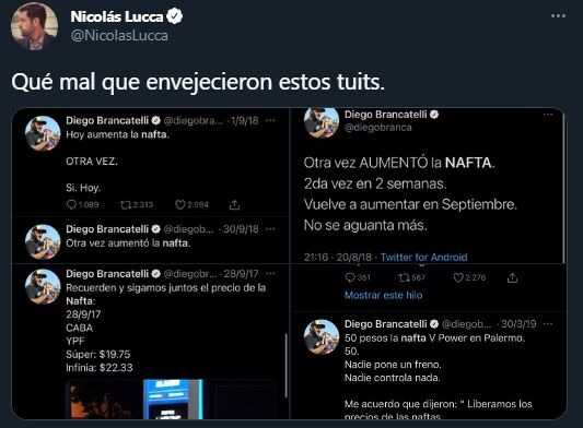 "Qué mal envejecieron estos tuits", se sumó el periodista Nicolás Lucca al compartir una serie de tuits quejándose de los aumentos durante la gestión de Macri.