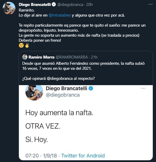 Brancatelli recogió el guante y salió a responder a las numerosas críticas que recibía. "Lo dije al aire en @Intratables y alguna que otra vez por acá. Te repito particularmente porque parece que te quito el sueño: me parece un despropósito. Injusto. Innecesario. La gente no soporta un aumento más de nafta (se traslada a precios). ¡Debería poner un freno!", escribió el periodista kirchnerista.