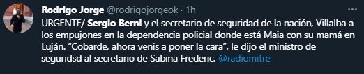 "¿Qué venís a hacer acá de trajecito, hijo de puta?", lo increpó Berni a Villalba apenas lo vio. Y continuó: "Vos y tu ministra, que es una inútil, le hacen mal a la policía, no me llamaste en todo el día y ahora venís acá a sacarte la foto, hijo de puta, te voy a cagar a trompadas".