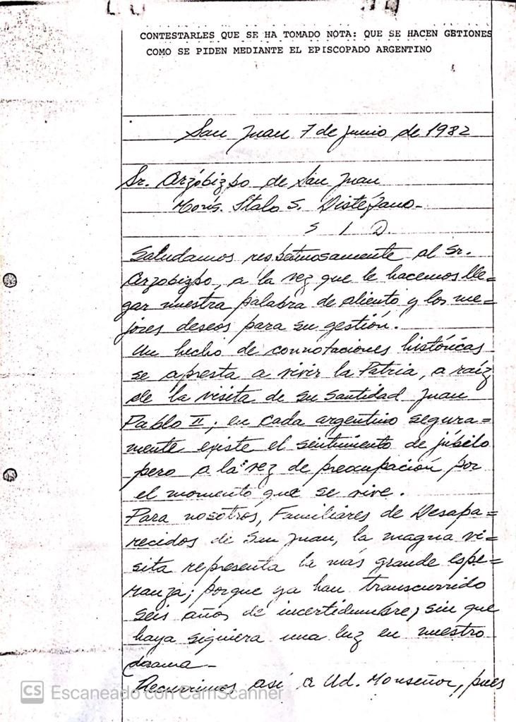 Esos documentos van desde 1976 hasta 1982 y un hecho clave: la visita del papa Juan Pablo II a la Argentina, que era para los católicos argentinos que sufrieron la dictadura una última esperanza de buscar respuestas. "Nuestro pedido se basa concretamente en solicitarle a ud. Monseñor, que ponga en juego toda vuestra energía y sensibilidad ante él su Santidad, para que se informe de una vez por todas sobre la suerte corrida por nuestros afectados", dice la carta escrita de puño y letra por uno de los familiares de desaparecidos y dirigida a quien era arzobispo de San Juan, Ítalo Severino Distéfano.