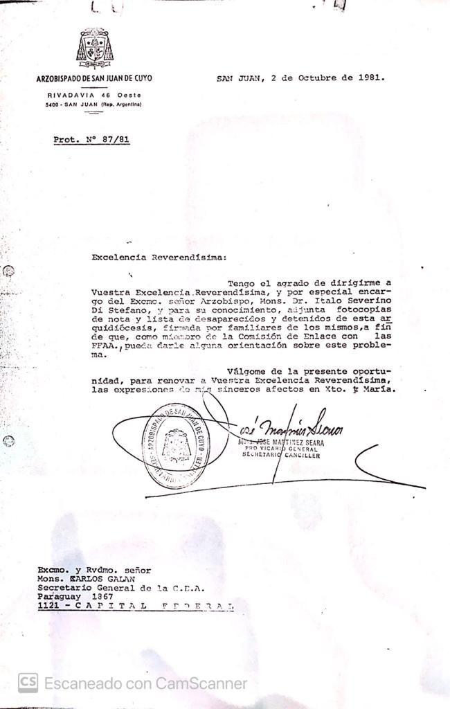 De esa manera se dirigía quien era Pro Vicario General del Arzobispado de San Juan, José Martínez Seara, al Secretario General de la Conferencia Episcopal, Carlos Galán y quien tenía el rol de reunirse con los jefes militares. La lista de desaparecidos que se adjuntaba era una copia de la realizada de puño y letra por los familiares. Hoy, la mayoría de ellos figura como desaparecidos.