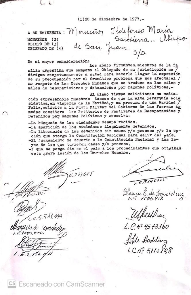 El 20 de diciembre de 1976, por ejemplo, y con motivo de la cercanía de la Navidad, los familiares de desaparecidos de San Juan solicitaron la intervención del obispo Sansierra para pedir información a la junta militar. "Los abajo firmantes, miembros de la familia argentina que compone el Obispado de su jurisdicción se dirigen respetuosamente a usted para hacerle llegar la expresión de su preocupación por el traumático problema que nos afecta: el no respeto por los derechos humanos que se traduce en las miles y miles de desapariciones y detenciones por razones políticas", dice la misiva.