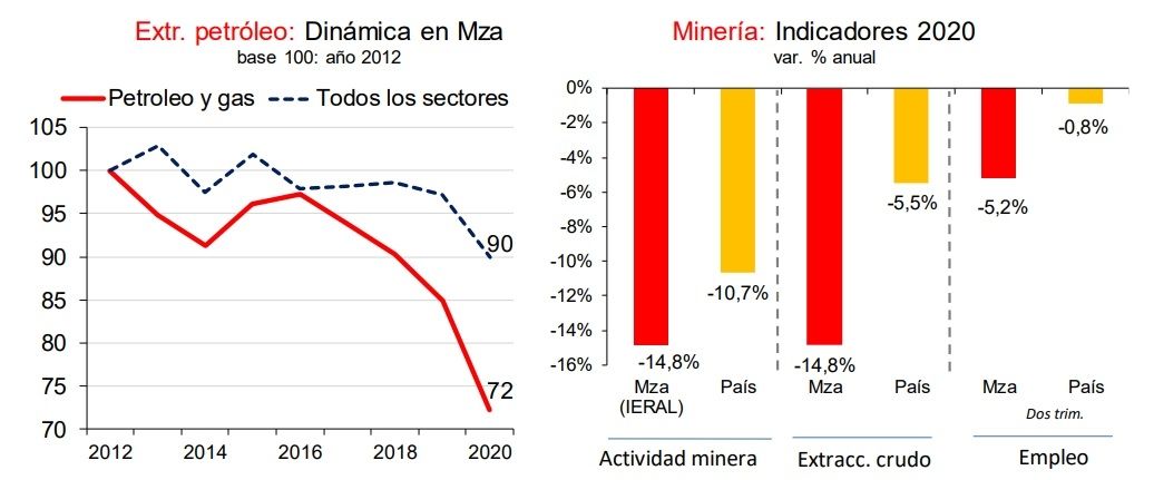 "Los factores explicativos se encuentran en una reducción de la producción anual de petróleo y gas del 16% y 33.2% respectivamente en conjunto con el desplome de los precios producto de la pandemia del Covid 19 que se redujeron, en promedio anual, 25.1% y 22.9% para el petróleo y gas mendocino respectivamente durante los últimos doce meses", indica el informe de EMESA.