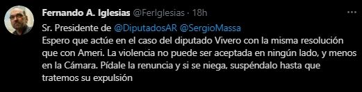 Este lunes Vivero reconoció la agresión aunque la minimizó asegurando que se trató de un "pequeño empujón". "Fue un intercambio bastante fuerte que terminó con un pequeño empujón. Quería que la corte con ese alto nivel de agresión", justificó el legislador del Frente de Todos.