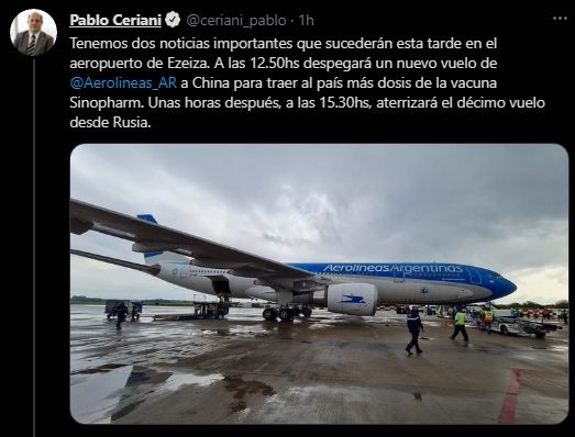 "Tenemos dos noticias importantes que sucederán esta tarde en el aeropuerto de Ezeiza. A las 12.50 despegará un nuevo vuelo de Aerolíneas a China para traer al país más dosis de la vacuna Sinopharm. Unas horas después, a las 15.30, aterrizará el décimo vuelo desde Rusia", escribió Ceriani en su cuenta de Twitter.