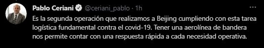 Ceriani explicó que se trata de "la segunda operación que realizamos a Beijing cumpliendo con esta tarea logística fundamental contra el Covid-19. Tener una aerolínea de bandera nos permite contar con una respuesta rápida a cada necesidad operativa".