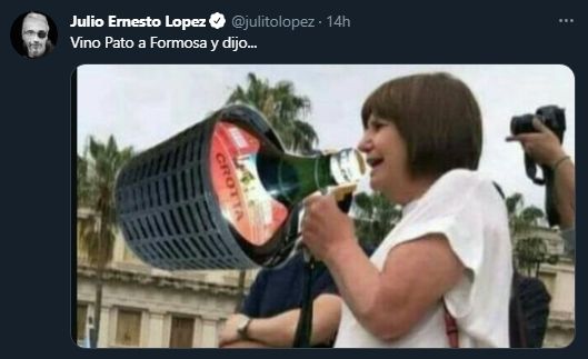 "Vino Pato a Formosa y dijo...", escribió López, y acompañó el tuit con una imagen de Bullrich en la que le habían reemplazado el megáfono por una damajuana de vino.