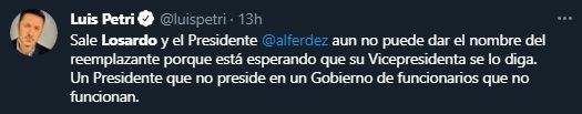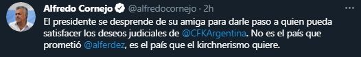 "El presidente se desprende de su amiga para darle paso a quien pueda satisfacer los deseos judiciales de Cristina Kirchner", se lamentó Cornejo en su cuenta de Twitter.