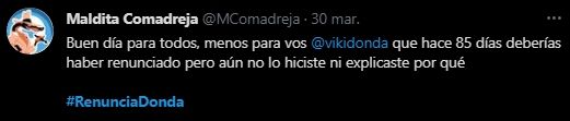Con el hashtag #RenunciaDonda, cientos de usuarios le reclamaron a la titular del Inadi que dé un paso al costado. "Buen día para todos, menos para vos @vikidonda que hace 85 días deberías haber renunciado pero aún no lo hiciste ni explicaste por qué", le reclamó uno de los usuarios más insistentes con la campaña.