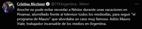 "Anoche no pude evitar recordar a Néstor durante unas vacaciones en Pinamar, atornillado frente al televisor todos los mediodías, para seguir “el programa de Mauro” que abordaba un caso muy famoso. Adiós Mauro Viale, trabajador incansable de los medios en Argentina", fue el mensaje con el que Cristina despidió al periodista.