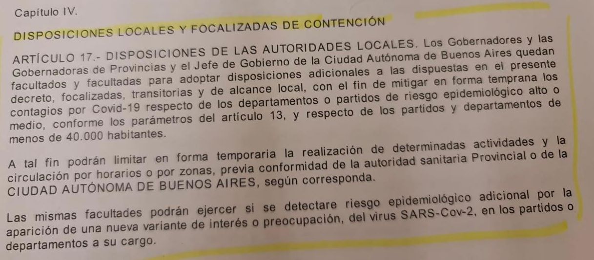 Alberto Fernández subrayó el DNU que firmó la semana pasada. Es el artículo 17 de ese decreto que le otorga a las provincias amplias potestades para tomar decisiones sobre la administración de la pandemia. Es decir, para restringir o cerrar actividades y tomar medidas adicionales. No fue casual. En medio de las tensiones y reuniones que hubo para analizar cambios, el Presidente apuntó duramente contra los gobernadores e intendentes por la falta de control y de medidas para controlar la pandemia. El enfoque que tomó Alberto es el de "regionalizar" las decisiones y se mantendrá: no habrá cambios en el DNU, pero sí más exigencia a los distritos para que tomen medidas. "Nos pueden pedir lo que necesiten, incluso fuerzas federales para controlar", explicaron desde Casa Rosada.