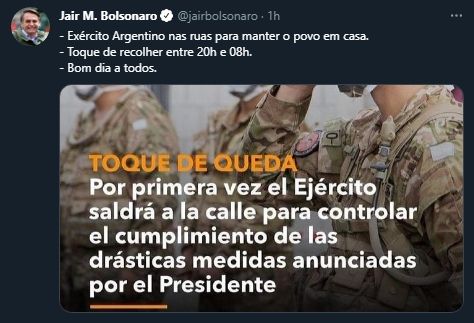 El presidente brasileño acompañó su mensaje con la captura de una nota de Infobae que destacaba que "por primera vez el Ejército saldrá a la calle para controlar el cumplimiento de las drásticas medidas anunciadas por el Presidente".